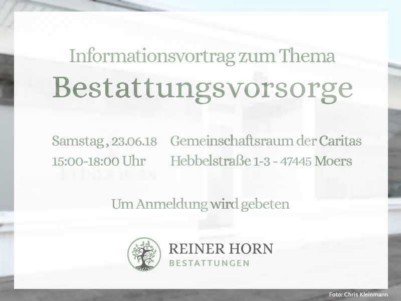 Informationsvortrag zum Thema Bestattungsvorsorge. In kooperation mit dem Caritasverband Moers-Xanten e.V. laden wir am Samstag den 23.06.18 herzlich zum Informationsvortrag mit dem Thema Bestattungsvorsorge ein. Wir freuen uns auf alle Teilnehmer und bitten um vorherige Anmeldung.