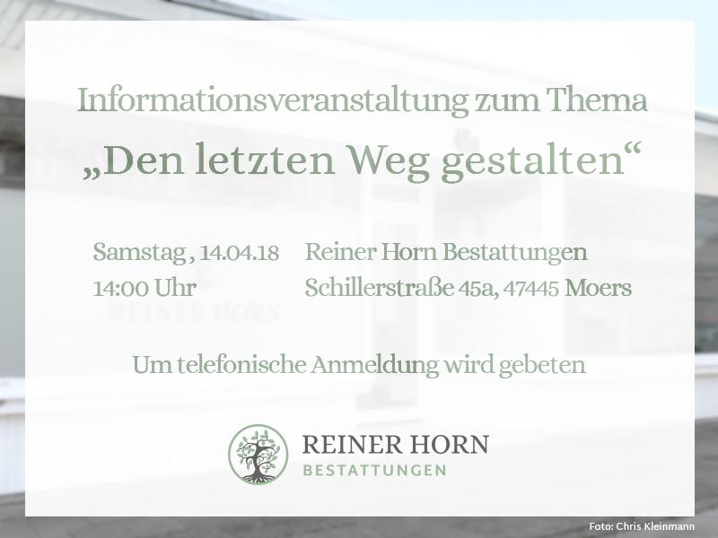 Informationsveranstaltung zum Thema „Den letzten Weg gestalten“. In Kooperation mit dem Vita e.V. (Verein zur Integration und Förderung der Trauerarbeit und Abschiedskultur e.V.) laden wir am Samstag den 14.04.18 herzlich zur Informationsveranstaltung mit dem Thema „Den letzten Weg gestalten“ ein. Wir freuen uns auf alle Teilnehmer und bitten um vorherige telefonische Anmeldung.
